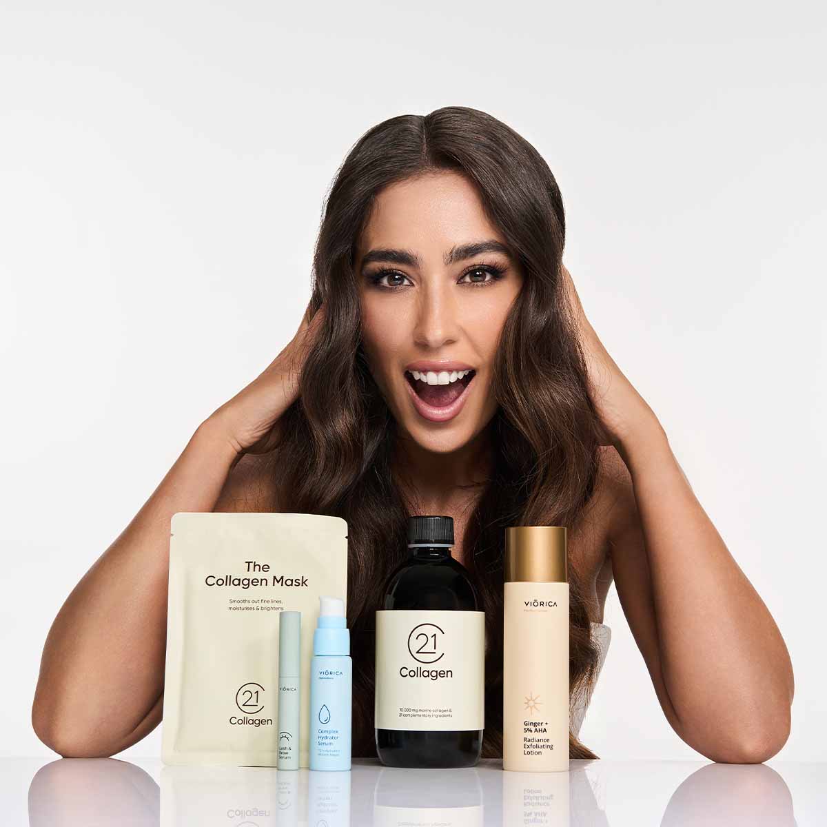 Ritualul Ancăi e despre piele fresh și sprâncene perfect definite — fără complicații. Loţiunea exfoliantă, Perfect Glow trezește pielea, ser-ul HydroBiotic hidratează intens, ser-ul pentru gene și sprâncene e pentru detalii care fac diferența, iar masca și suplimentul 21 Collagen completează rutina, lăsând pielea fermă și radiantă. Glow - ul este garantat.